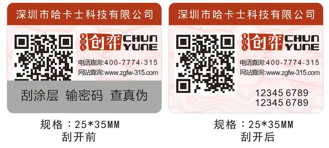 2、技术原理 二维码防伪标签是应用二维码技术以及无线通讯网络技术,以二维码为信息子载体,对每一个商品信息进行跟踪、采集、汇总、查询、管理等,一品一码,正品防伪建立商品信息管理数据链和整个流通过程监管系统,通过手机终端中安装的识读软件,如使用微信轻松扫一扫,即可实时方便的查询商品信息,有效辨别产品真伪,构建阻击假冒伪劣的“防火墙”。 3、优势特点: 二维码防伪标签具有以下优势特点: 1查询便捷:使用手机微信,即可通过移动网络随时随地进行查询产品真伪信息。 2品牌宣传:消费者在核对产品信息的同时,可与企业互动,增强用户对品牌的信赖。 3数据收集:能够对顾客数量、行为进行准确抓取并统计,并实时获取消费者反馈的信息。 4打击假冒:加密二维码的形式加大了造假者的造假成本,促使造假无利可图。4、应用领域 正标防伪的二维码防伪标签广泛适用于多行业多品类,我们的客户覆盖多个行业,如印刷、交通、金融、医疗、食品、化妆品、烟酒、茶叶、日用品等各类行业领域都有,我们的标签还可根据客户需要个性化定制,除了防伪功能,还提供防窜货、会员积分、溯源、渠道管控、扫码通等一系列增值服务。