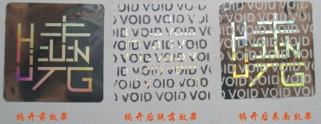 揭开留底防伪标签是以材料为主的防伪方式,如标签被揭开就会从面材上分离出预先设定的文字或图案,如:“VOID”、“启封”、“已开封”等字样,并留在被贴物上,从而达到保真的目的,并提供自动检验的功能。
