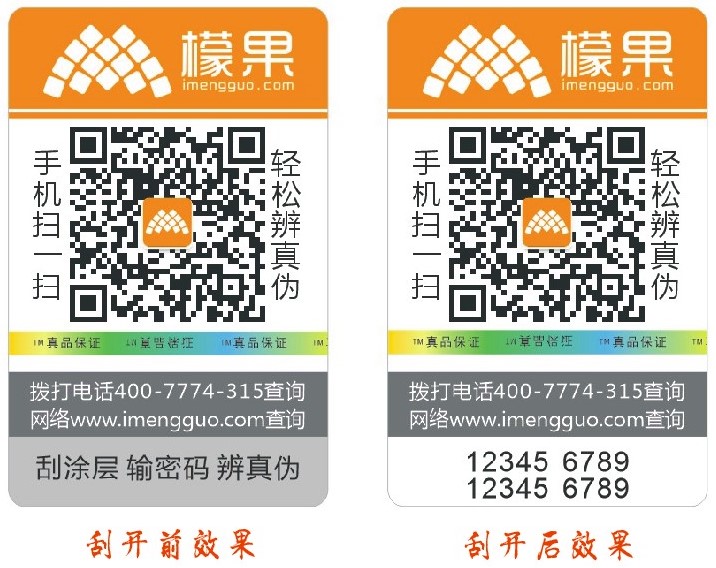 二维码防伪标签是以二维码为信息载体,通过正品防伪的防伪系统赋予每一个产品一个唯一的防伪编码并标识于二维码标签上,再将标签贴到产品或包装上,如同每一个人都有唯一的身份证号码一样,消费者购买后扫一扫产品上的二维码即可验证产品真伪。
